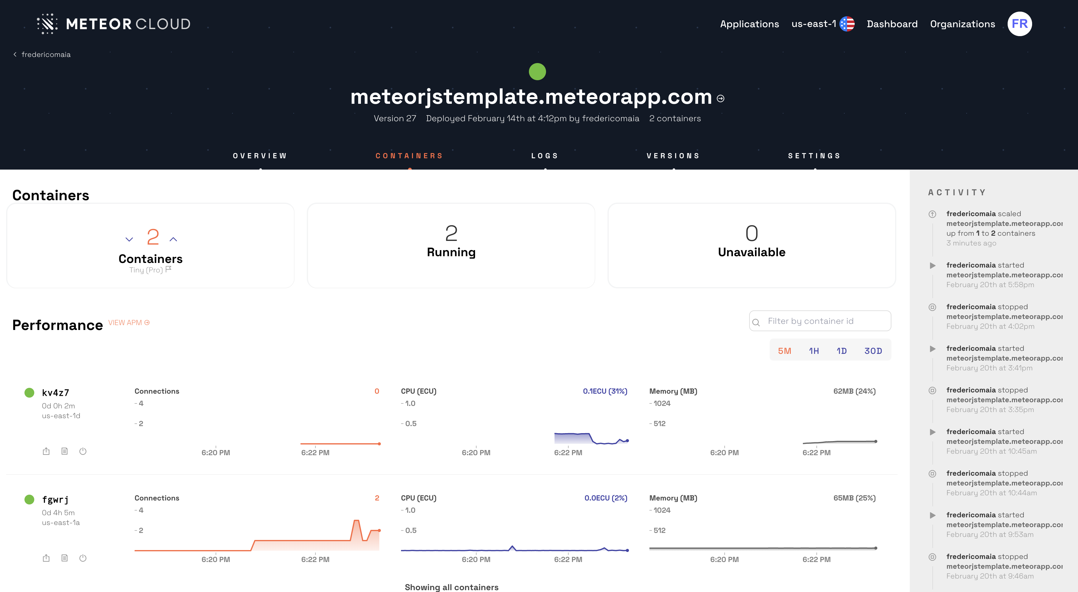 Galaxy containers are packaged environments for Meteor apps. Dive into individual container performance metrics on the container page. Read more in the containers and container environment articles.